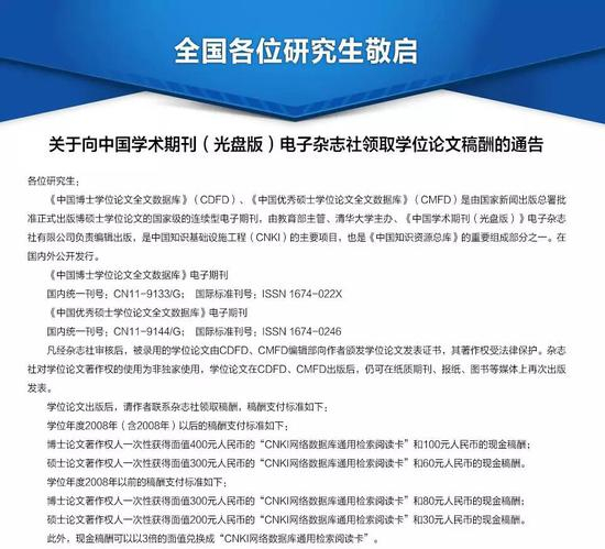 “2008年(含)以后的稿酬支付标准:博士论文著作权人一次性获得面值为400元人民币的‘CNKI网络数据库通用检索阅读卡’和100元人民币的现金稿酬。硕士论文著作权人一次性获得面值为300元人民币的‘CNKI网络数据库通用检索阅读卡’和60元人民币的现金稿酬。此外,现金稿酬可以以3倍面值兑换成“CNKI网络数据库通用检索阅读卡”。”