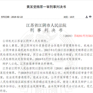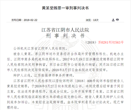新浪财经讯 2月26日消息,裁判文书网显示,江苏省江阴市商务局外贸管理科科长、机电科技科科长黄某利用职务便利收取他人贿赂30.6万元,被依法判处有期徒刑2年。其中,吉鑫科技、宝利国际、海达股份等多家企业人员向其行贿。