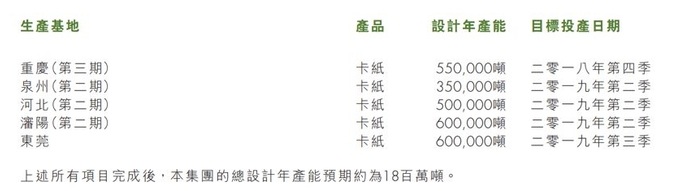2017年8月,公司的越南基地二号纸机投产,设计产能35万吨卡纸,并于2018年1月正式开始商业生产。