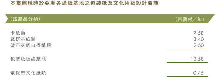 截至2018年6月,集团的总产能约为1,500万吨,主要分布在亚洲(以大陆为主)。如下图所示,集团在亚洲各造纸基地的包装纸和文化用纸的产能超过了1,400万吨,其中东莞、太仓以及天津三地的占比最大。