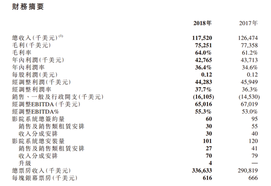 年报显示,2018年实现营业收入1.08亿美元,相比较于2017年的1.26亿美元下降16.67%,拖累收入的板块主要是影院业务。