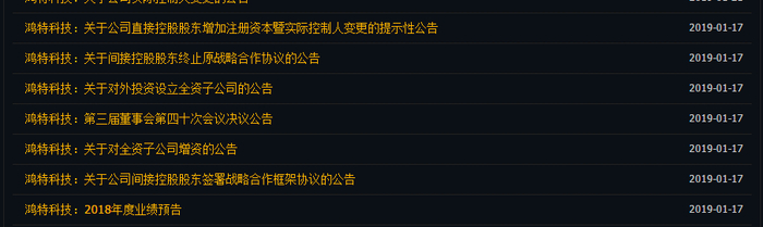 在关联方达成合作6个月后,2019年1月17日鸿特科技一连发出7则公告。这7则公告大体表示,鸿特科技、万和集团、派生集团之间的合作领域正式由互金领域调整为环保智造领域,这其中最醒目的公告便是实际控制人变更,唐军正式走到前台。