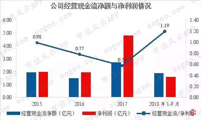 从公司经营现金流与净利润对比情况看,公司经营现金流对利润的保障倍数2016年为0.77次,2017年由于非经常性损益(主要系投资收益)的原因,经营现金流对利润的保障倍数下降到0.56次,2018年1-9月该比例得到改善,经营现金流对利润的保障倍数上升到1.19次,相当于每1元的利润有1.19元的经营现金流净额支撑。