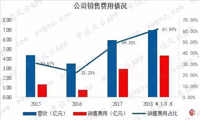 从上图可以看到,受“两票制”政策的影响,公司的销售费用占营收比重快速抬升,在2017年、2018年1-9月分别达到49.33%、61.59%。