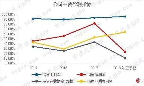 从公司主要盈利指标看,近几年来,公司销售毛利率非常高,期间费用率也在不断抬升, 2017年,主要由于投资收益较大的原因,公司的销售净利率有快速的提升,但随后即出现滑落。