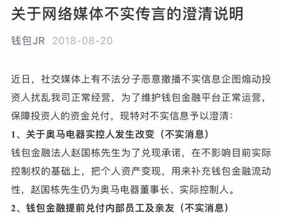 为此,2018年8月20日钱包金融官方微信发出一封澄清说明,表示以上均属不实消息。