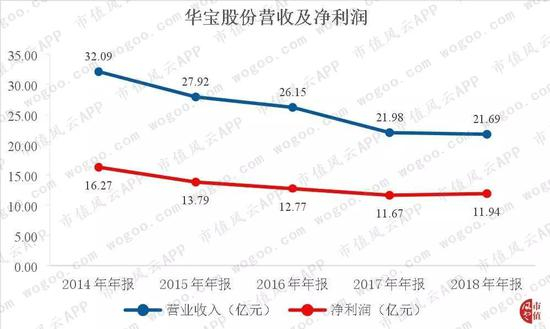 从2014年至2018年,公司营业收入从32.09亿元一路下降到21.69亿元,年均复合增长率为负的9.33%,2018年的营业收入比2014年下降了约三成,净利润也不断跳水,从2014年的16.27亿元下降至11.94亿元,年均复合增长率下降了7.44%。