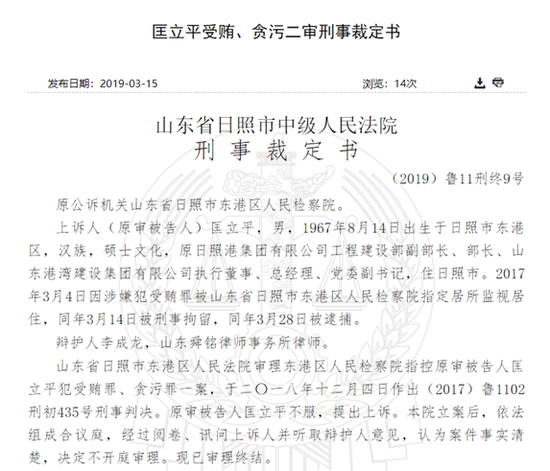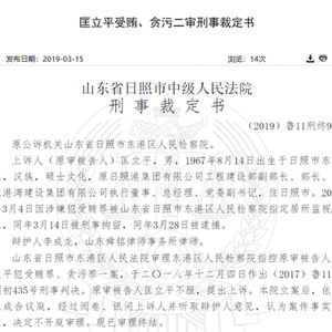 新浪财经讯 3月15日,裁判文书网公布了元日照港集团原日照港集团有限公司工程建设部副部长、部长、山东港湾建设集团有限公司执行董事、总经理、党委副书记匡立平二审刑事裁定书。匡立平共计受贿共计1692万元、贪污公款263万元,其中贪污的大部分公款用于为时任日照港集团董事长杜传志支付房屋装修款、购买家具窗帘。