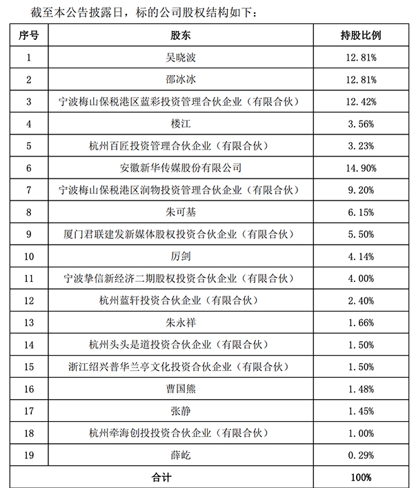 巴九灵文化的法定代表人为吴晓波,注册资本7500万元。吴晓波和妻子邵冰冰分别直接持有巴九灵12.81%的股权,为巴九灵的实际控制人。