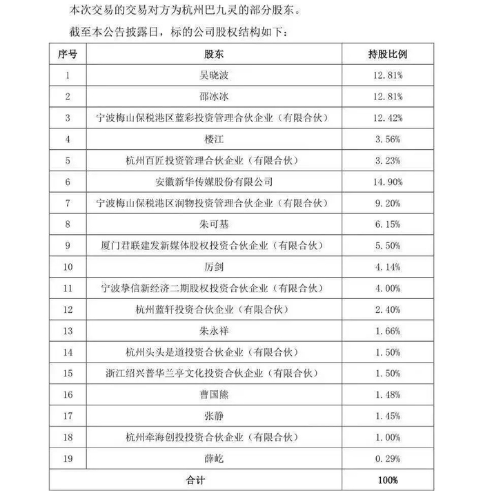 公告显示,吴晓波邵冰冰夫妇及一致行动人蓝彩投资、百匠投资、楼江合计持有杭州巴九灵44.83%股权,其中蓝彩投资由邵冰冰担任执行事务合伙人,百匠投资是高管持股平台,楼江为邵冰冰亲属。杭州巴九灵的第二大股东为上市公司皖新传媒(持股14.9%),其他机构投资人还包括君联资本(持股5.5%)、挚信资本(持股4%)以及曹国熊的普华资本、浙商创投等。