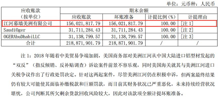 2018年年报显示,美国商务部对美洲江河从中国大陆进口铝型材发起的“双反”(指反倾销、反补贴调查)诉讼案件前景不容乐观,同时美国海关就其与美洲江河进口关税争议作出了行政处罚决定。尽管美洲江河仍在积极应诉,但两案最终结果仍有较大可能性使其面临补缴税款和巨额罚款。“目前其财务状况已严重恶化,未来持续经营状况堪忧”,公司对其所欠1.56亿货款全额计提坏账准备。