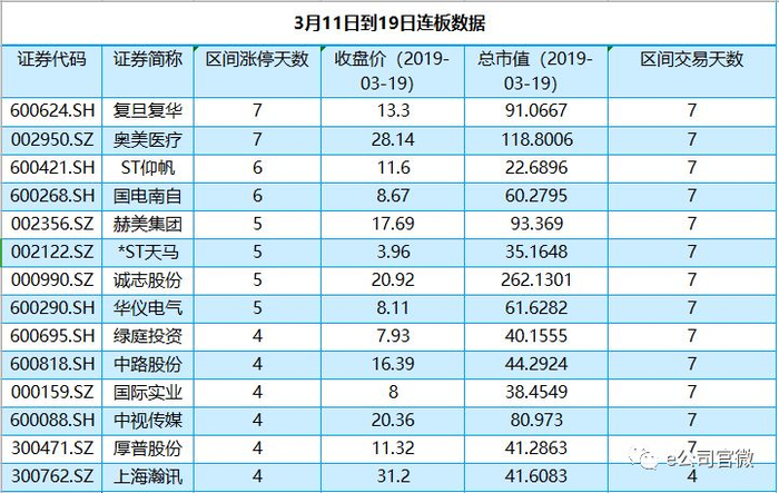 事实上,与复旦复华同期(3月11日到19日)实现连板的公司,除去新股奥美医疗同样为七连板外,还有ST仰帆、国电南自六连板;赫美集团、*ST天马、诚志股份和华仪电气实现五连板;绿庭投资等6家公司四连板。
