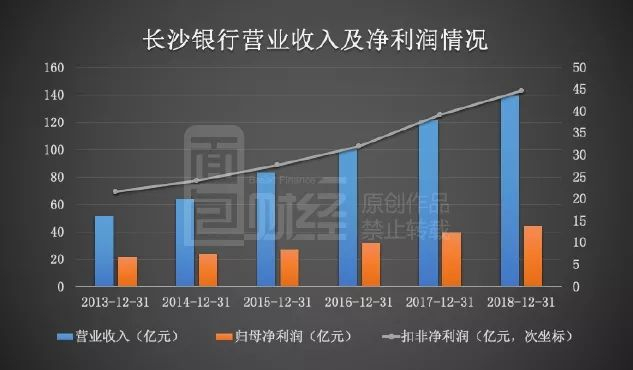 年报显示:2018年长沙银行实现营业收入139.41亿元,较上年同期增长14.95%;实现归母净利润44.79亿元,较上年同期增长13.94%。