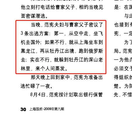 范宪东窗事发后,曾试图出逃,当时曹、范两家密议了三条出逃方案,其中最后一条是躲入牡丹江的深山老林之中,“来个人间蒸发”。