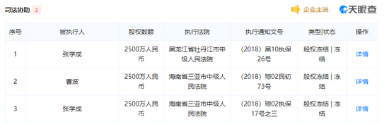 此案最终张学成败诉,海南天懋并未解散,而曹波起诉张学成一案目前并未有进一步的消息。另据天眼查显示,两人的股份均已遭到冻结,可谓一对最不情愿在一起的“难兄难弟”。