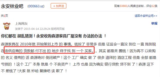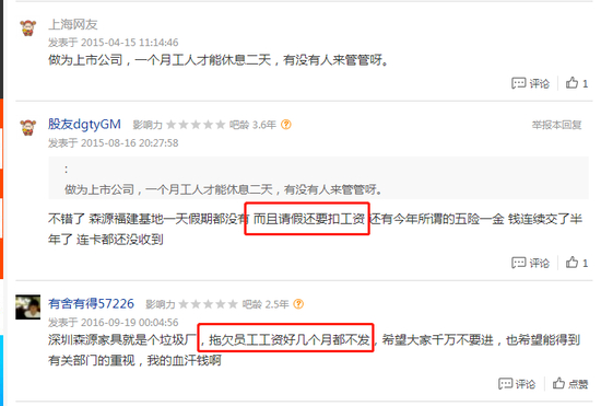 2015年4月,东方财富股吧有一个股友爆料称,森源家具的资金链是非常紧张的: