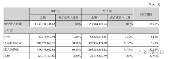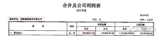 笔者对比了永安林业母公司财务报表和其子公司森源家具的审计报表,发现两者的契合度非常大。2017年人造板行业和家具装饰业分别为上市公司带来3.82亿和7.49亿元营业收入。而永安林业母公司和森源家具分别为上市公司带来3.80亿元和7.65亿元营业收入。