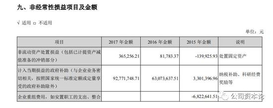 而分析永安林业的非经常性损益结构,我们能够看出,政府补助是其中很大的一块。2016年中,1.2亿元的非经常损益中,6000万的政府补助占据了半壁江山,而到了2017年,1.5亿的税前非经常性损益中(近似等于上表中2017年1.22亿非经常性损益加2600万的所得税影响额),9200万的政府补助占比超过了六成。