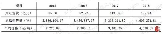 从上表可以看到,2016年以来,公司原纸平均销售单价开始上涨。到2018年,公司原纸销售单价已上涨至4,036.65元/吨。