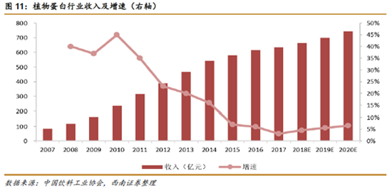 先从同品类产品看,植物蛋白饮料行业在销售收入增幅经历数年的连续下滑后,于2018年实现了回升。具体数据来看,由2013年的11.92%一路下滑至2017年的4.97%,2018年回升至7.32%以上。2015 年至今,受竞品品类增多且增速较快、植物蛋白产品结构升级缓慢的影响,但是行业增速至今下降到10%以下。
