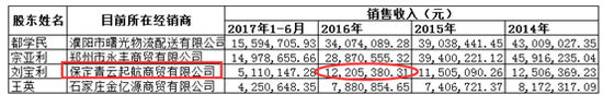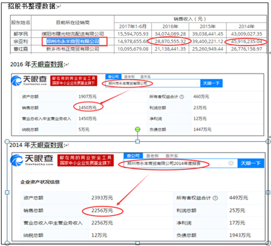再看郑州市永丰商贸有限公司(简称“永丰商贸”),永丰商贸既为客户也为股东,也是公司前二十大客户之一,但是公司披露其2018年未与公司发生交易往来。2014年至2017年,其与公司销售收入交易发生额分别为4591万元、3940万、2887万元及1614万元。根据天眼查,对比永丰商贸披露的年报数据,永丰商贸2014年销售额仅为2256万元,与公司招股书披露数据相差一倍,永丰商贸2016年销售额仅为1450万元,与公司招股书披露数据相差近一倍。