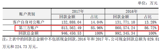 此外,公司客户销售和回款存在不一致的情形,除了客户以自身对公账户回款外,还存在客户以包括客户实际控制人、控股股东、个体经营者、其他股东、前述人员关系密切家庭成员等亲属、纯董监高以及纯员工如财务人员的账户等第三方账户回款的情形。2016年至2017年,公司第三方回款金额分别为86.06亿元、81.36亿元,对应回款总额占比为86.72%、85.96%。具体情况如下: