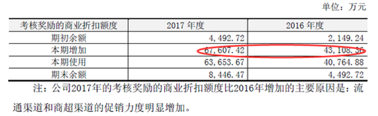 根据披露信息显示,公司2017年新增的奖励考核的商业折扣高达6.76亿元。