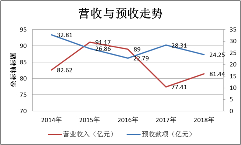 根据近五年报表发现,2015年至2018年营业收入同比变动幅度分别为10.35%、-2.38%、-13.02%及5.21%,而预收款项变动幅度分别为-18.13%、-15.15%、24.22%及-14.34%。