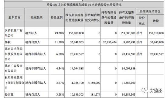 从上表中我们可以看到,汉桥机器厂所持上市公司股份几乎全部被质押,同时,汉桥机器厂还出现了债务违约,上市公司也因承担连带担保责任被列入失信执行人。