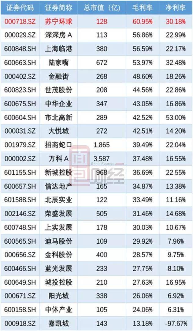 一组需要重点关注的数据是,苏宁环球2018年的毛利率和净利率水平分别达到了60.95%和30.18%。毛利率在已披露年报且市值超过100亿的房地产开发企业中排名第一,净利润率位居前三。