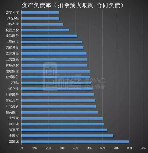 根据新的会计准则要求,部分房企把地产销售合同中收取的预收款计入合同负债科目。因此,在计算资产负债率时我们在分子端同时剔除了预收账款和合同负债金额。