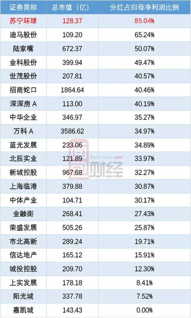 从中可以看到,苏宁环球以分红总额占归母净利润的比例85.04%排名第一,高于招商蛇口、万科、陆家嘴等老牌房地产龙头企业。