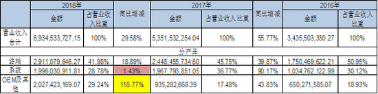 从产品结构细分看,2018年,公司终端产品、系统产品、OEM及其他产品收入分别为29.11亿元、19.96亿元及20.27亿元,对应收入占比分别为41.98%、28.78%及29.24%。其中,报告期期内,OEM及其他产品收入增速最快,同比上一年增加116.77%;而系统产品增速明显放缓,由2017年90.17%的增速下降至1.43%。