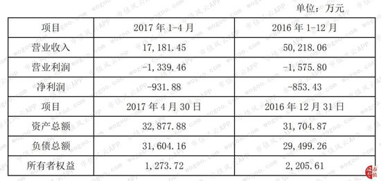 从上表分析得知,上海欧蓝在2016年至2017年4月的净利润累计亏损1785.31万元,且截止2017年4月30日,净资产账面值仅为1273.72万,资产负债率高达96%。