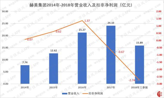 从上图得知,赫美集团的营业收入从2014年的7.74亿元上升值2017年的24.1亿元,复合增长率高达46.02%,增长速度较快。但同期扣非净利润呈现先上升再下跌的趋势, 2016年表现最好,盈利1.37亿;2018年三季报表现最差,亏损2.74亿。