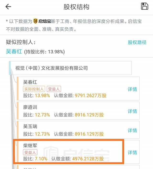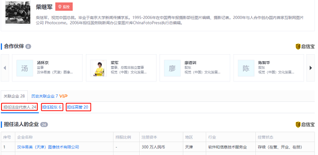 然而,第一财经记者通过查询启信宝发现,柴继军名下有一家名为华盖创意(北京)图像技术有限公司的公司,视觉中国对其100%持股。