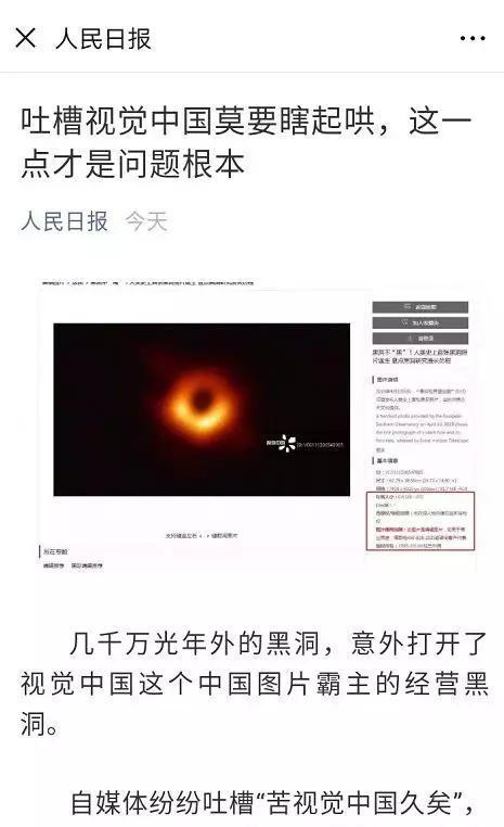4月11日,视觉中国网站上出现了10日晚公布的人类史上首张黑洞照片,并将此图进行了“商业化”。此事迅速在网上引起轩然大波,共青团中央、人民日报等媒体都在各自的官方微博上对此事发表了评论,人民日报的官方微博甚至从昨日晚间到今日上午总共3次对此发布了相关消息。