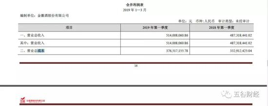 《五谷财经》注意到,2019年第一季度,金徽酒营业总成本接近3.77亿元,与2018年第一季度约为3.33亿元相比,增幅在13%以上。