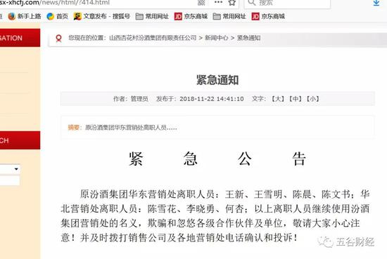 2018年11月,汾酒集团发布了紧急通知称,原汾酒集团华东营销处离职人员:王新、王雪明、陈晨、陈文书;华北营销处离职人员:陈雪花、李晓勇、何杏;以上离职人员继续使用汾酒集团营销处的名义,欺骗和忽悠各级合作伙伴及单位。