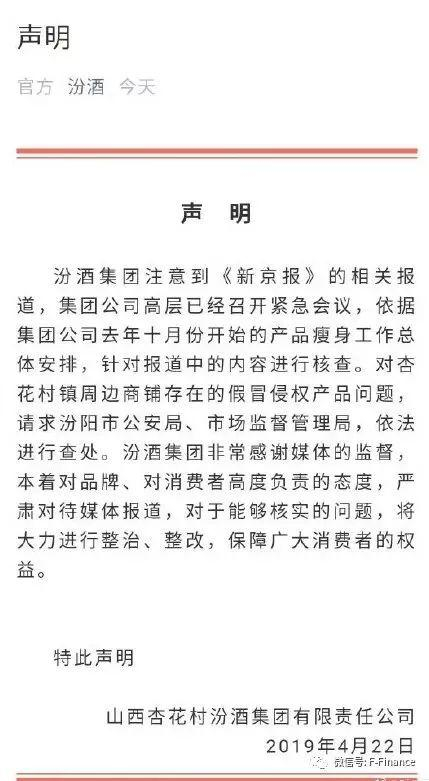 对此,22日午间,山西杏花村汾酒集团发表声明称,将针对汾酒开发酒乱象报道中的内容进行核查,请求执法部门对假冒侵权产品问题进行查处。