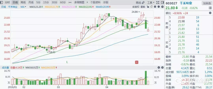 4月24日晚间,千禾味业发布了2019年一季度财报,报告期内公司的归母净利润同比下降了54.05%。受此影响,公司预计今年上半年的净利润将发生较大减少。之后,市场对公司业绩下滑反应强烈,股票在4月25日以接近跌停报收。