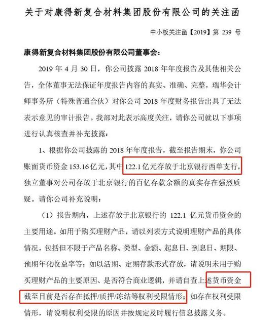 关注函关注的问题是公司货币资金问题,公司年报显示有122亿元货币资金存放于北京银行西单支行,但是独立董事强烈质疑公司这122亿元存款的真实性,深交所要求公司说明这122亿元货币资金目前的存在状态,以及公司总部在江苏省张家港,为何要把这么大笔资金存放于北京银行西单支行?