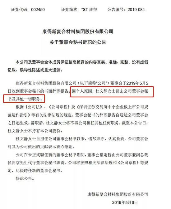 5月6日晚间,康得新公告公司董秘杜文静因个人原因辞去公司一切职务,印象里,杜文静应该是2019年无法保证公司年报真实性的第一位董秘。自三年前来到公司担任董秘,一年约90万的薪酬,杜文静职业生涯本可以迎来一片光明,但是董秘这一行就是这样,就算是很白的白马也有可能成为黑天鹅,此时抽身离开处于被立案调查的康得新,杜文静或许心里也没有底会不会被处罚。