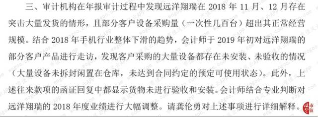 根据公告,立信会计师事务所在年报审计过程中发现远洋翔瑞在2018年11月、12月存在突击大量发货的情形,且部分客户设备采购量(一次性几百台)超出其正常经营规模。