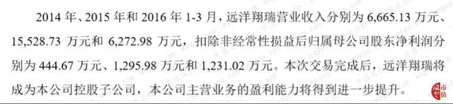 蹊跷的是,交易方案中远洋翔瑞的历史业绩与之前冲刺新三板时的数据有所不同。根据交易方案,远洋翔瑞2014年营收6665.13万,归母扣非净利润444.67万;2015年营收达到1.55亿,归母扣非净利润1295.98万。