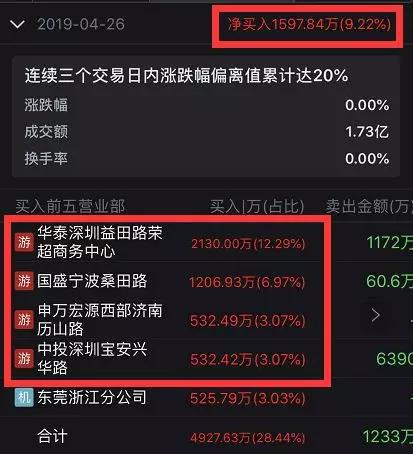 盘后龙虎榜数据显示,该股游资云集,包括华泰证券深圳益田路荣超商务中心、光大证券宁波中山西路、国盛证券宁波桑田路等活跃游资集中营业部出现在榜单上。不少人称,这是弱市下又一只横空出世的新妖股。