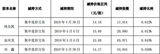 5月7日公告显示,董事周全凯、董事金凤龙、监事刘鑫,自4月30日起至5 月6日,因个人资金需要减持股份15.86万股,占公司总股本的0.104%,占承诺减持股份数的39.042%。