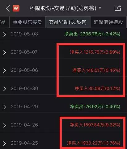 数据显示,4月25日至今科隆股份7次的登上龙虎榜。其中5次为净买入状态。