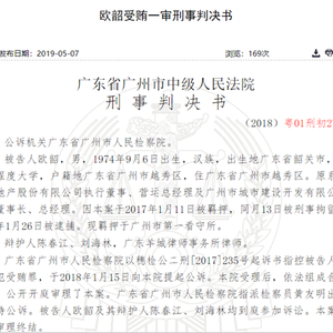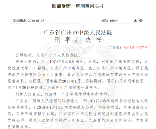 新浪财经讯 近日,裁判文书网显示,原越秀地产执行董事、营运总经理及广州市城市建设开发有限公司副董事长、总经理欧韶因帮助他人与公司签订6500万咨询合同受贿1167万,被判处有期徒刑11年。