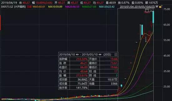 兴齐药业因为在4月10日至4月26日期间的13个交易日当中收出了12个涨停板,成为A股商场上当之无愧的“妖王”。